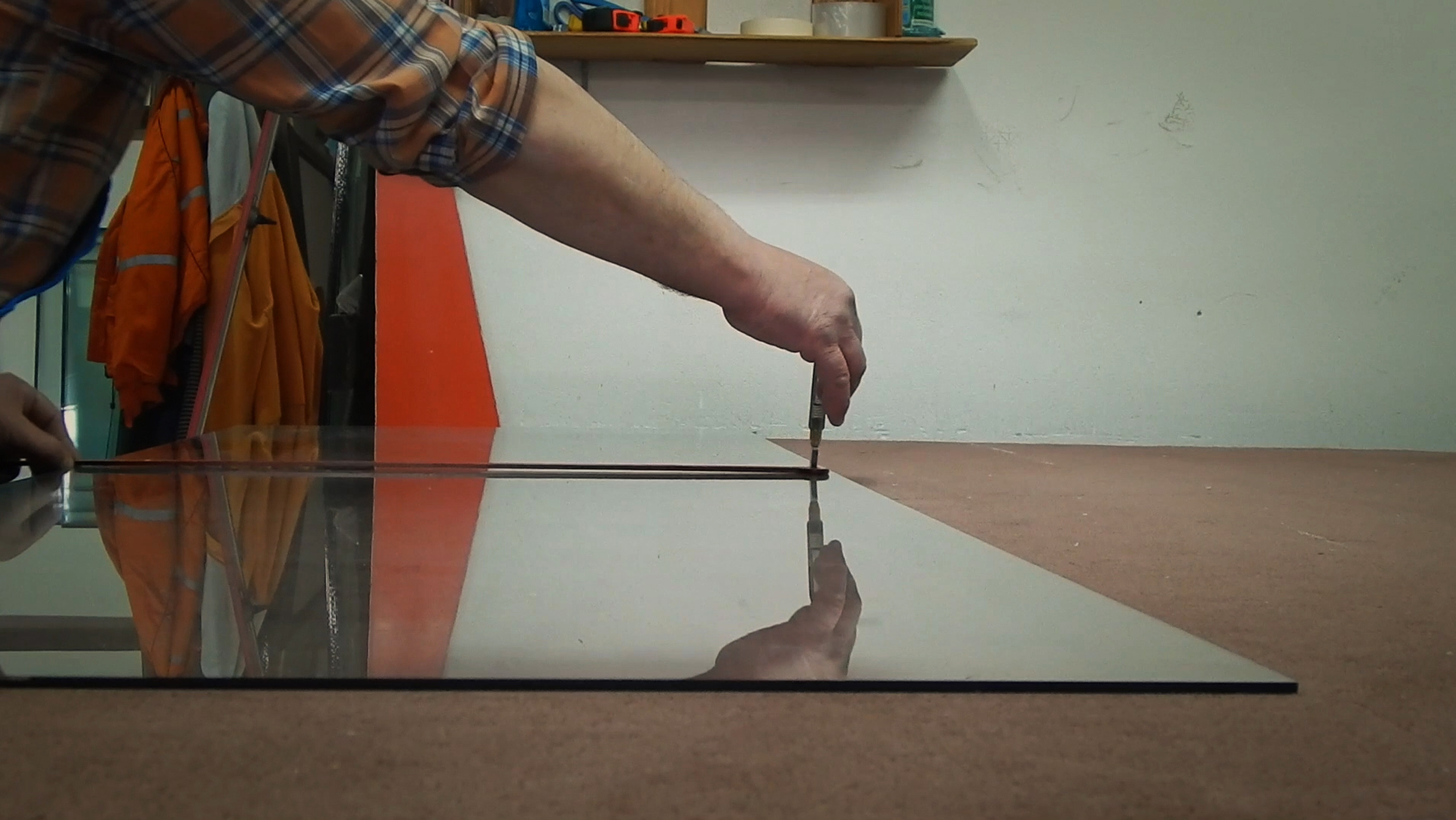 Con LA CAJA, acción feminista del orden del body art, Constanza Gonzalez intenta hacer ostensible la heteronomía de la mujer en sociedades patriarcales como la nuestra. Que el material con el que construye su metáfora visual sea transparente es una de las muchas ironías de la pieza. Las tres tomas que componen la videoperformance también funcionan simbólicamente: la toma principal, frontal y de encuadre simétrico, parece reflejar la naturalización de los valores patriarcales mientras que la segunda toma, que por su ángulo picado remite a la de una cámara de seguridad, explicita la dimensión regulatoria de los mismos, y la toma del cortado de los vidrios el trabajo, preciso y regular, que requiere sostener dicha estructura de poder.
