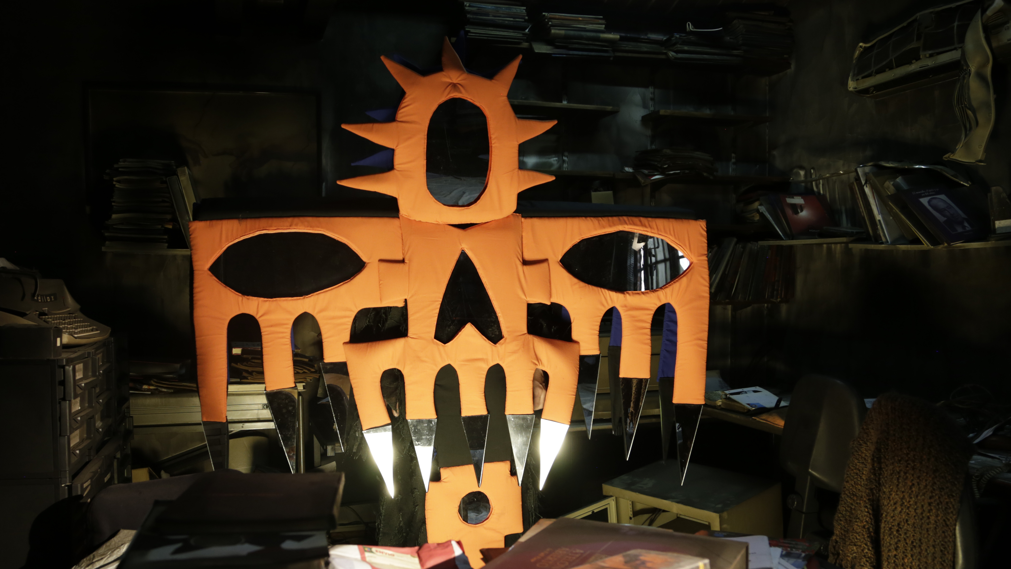 Nacidos de una sincrética mitología personal que combina elementos de diversas culturas (precolombinas, asiáticas y africanas) y géneros como el cómic y la ciencia ficción, los seres encarnados por Tadeo Muleiro cobran vida narrativa en sus performances y videoperformances. Estas activaciones de sus esculturas blandas y trajes resultan en la superposición de dos mundos: el mítico y el real. EL PADRE es una suerte de exorcismo que Muleiro, protegido por la criatura-traje que habita, realiza en las ruinas quemadas de la casa donde fue asesinado su padre. Los espejos incorporados al traje absorben la realidad y a la vez la devuelven transformada. Así es que el hijo puede emplazar a manera de laude obras de su padre (también artista) en el lugar del siniestro.